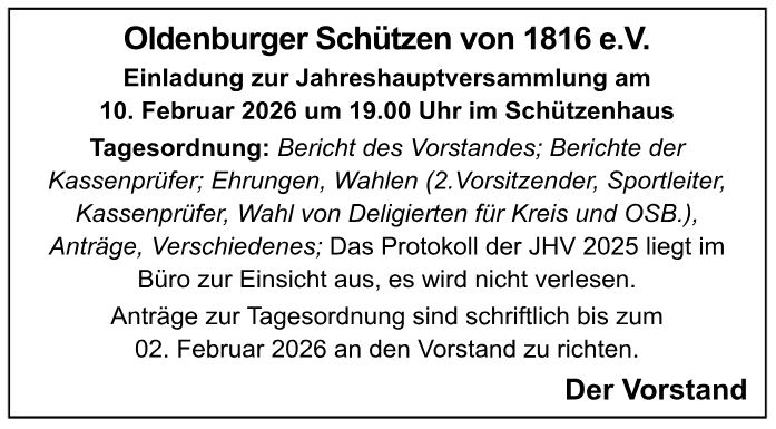 Die Oldenburger Schützen machen in der Zeit vom 19.12.2025 bis zum 5.1.2026 ihre Winterpause. Der Verein / das Gelände ist in dieser Zeit geschlossen. Zeit zum Durchatmen, ein paar Reparaturen zu erledigen oder ein paar ruhige Tage im Kreise seiner Lieben zu verbringen. Wir wünschen allen Mitgliedern, Freunden und Interessierten eine ruhige Zeit, einen